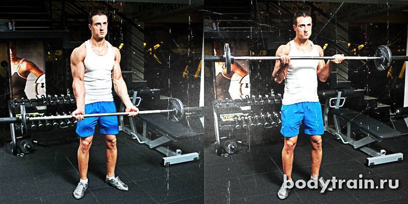| Подъём штанги | Встать прямо, ноги на уровне плеч, штангу взять чуть уже или примерно также. Локти не должны уходить в стороны. Штанга поднимается максимально интенсивно, а движение вниз производится медленно. В крайней точке делается небольшая пауза. |