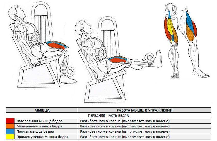 Разгибания ног в тренажере преимущественно нагружает именно четырехглавую мышцу бедра или квадрицепс. Это одна из самых крупных мышц тела, а ее основная задача заключается в разгибании голени, то есть совершает распрямление ноги. В некоторой степени квадрицепс помогает сгибать бедро.