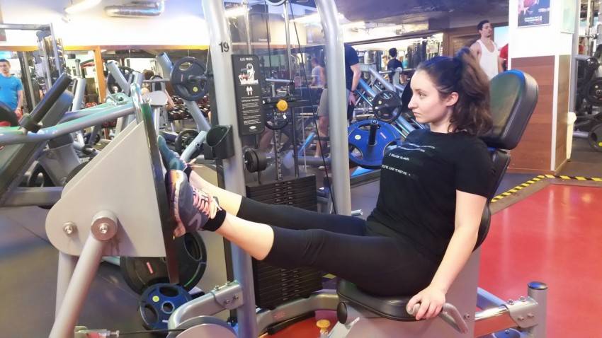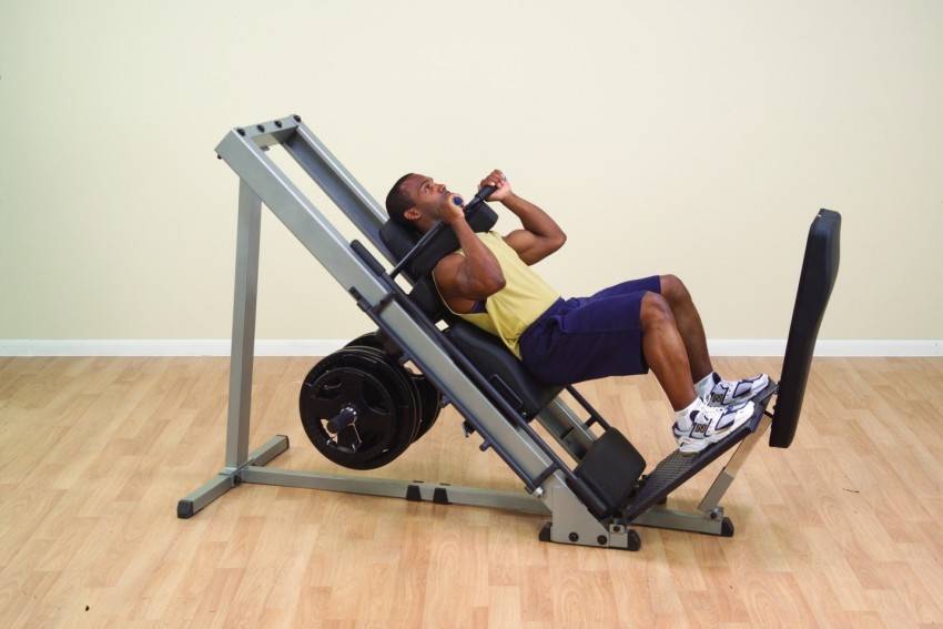 - Кроме того, убедитесь, что угол в коленном суставе ваших ног равен 90 градусам между голенями и бедрами ног. Если этот угол меньше 90 градусов, то это означает, что колени выступают за носки, а этого следует избегать, поскольку это в свою очередь создает чрезмерную нагрузку на коленный сустав. Если тренажер разработан таким образом, то либо поищите другую машину, либо просто следите за тем, чтобы при выполнении упражнения после достижения угла 90 градусов в коленях, ноги не разгибались дальше.