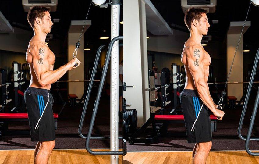 Кроме того, нужно следить, чтобы разгибание действительно тренировало трицепс, а не «все тело». Конечно, соблазн прослыть «самым сильным в зале», разгибая руки с самым большим количеством плиток, велик, но не стоит ему поддаваться, и просто терять время, «качаясь по инерции».