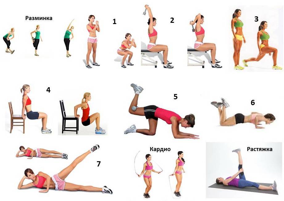 Обязательно включите в свою программу тренировок кардио нагрузку. Дополняйте ее силовыми упражнениями на проработку конкретных групп мышц. Не забывайте держать темп — длительные периоды отдыха будут отдалять вас от цели. После занятий не спешите баловать себя углеводами и жирами — кушайте не раньше, чем через час-полтора.