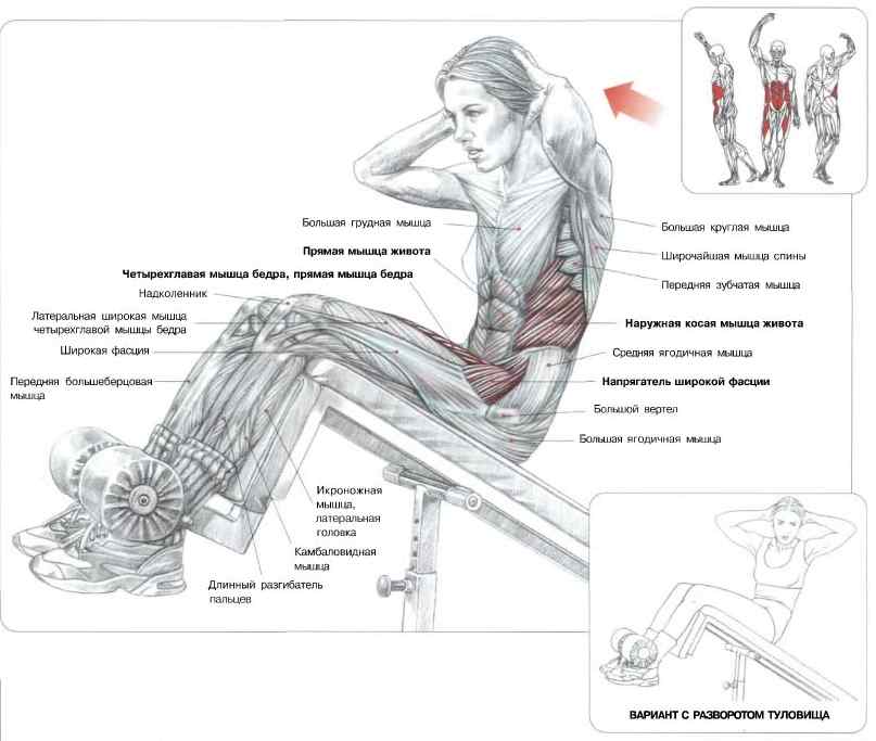 Когда вы выполняете скручивания на полу, задействована прямая мышца живота, а дополнительно также работают наружные косые.