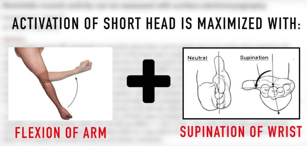 Максимальная активация обеспечивается сочетанием сгибания руки и супинации предплечья (разворота во внешнюю сторону) – еще одной функции бицепса (исследование).