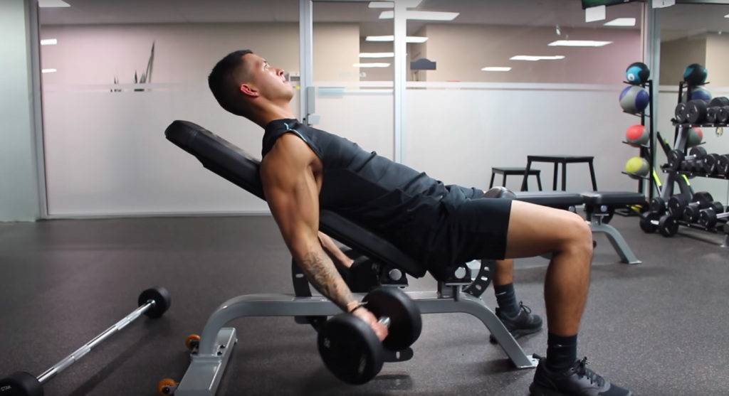 - Сгибание рук с гантелями на наклонной скамье: 3 подхода по 6-8 повторов,