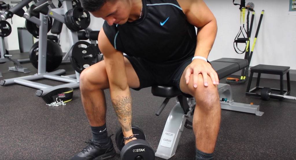 - Концентрированный подъем на бицепс с гантелью: 3 подхода по 6-10 повторов,