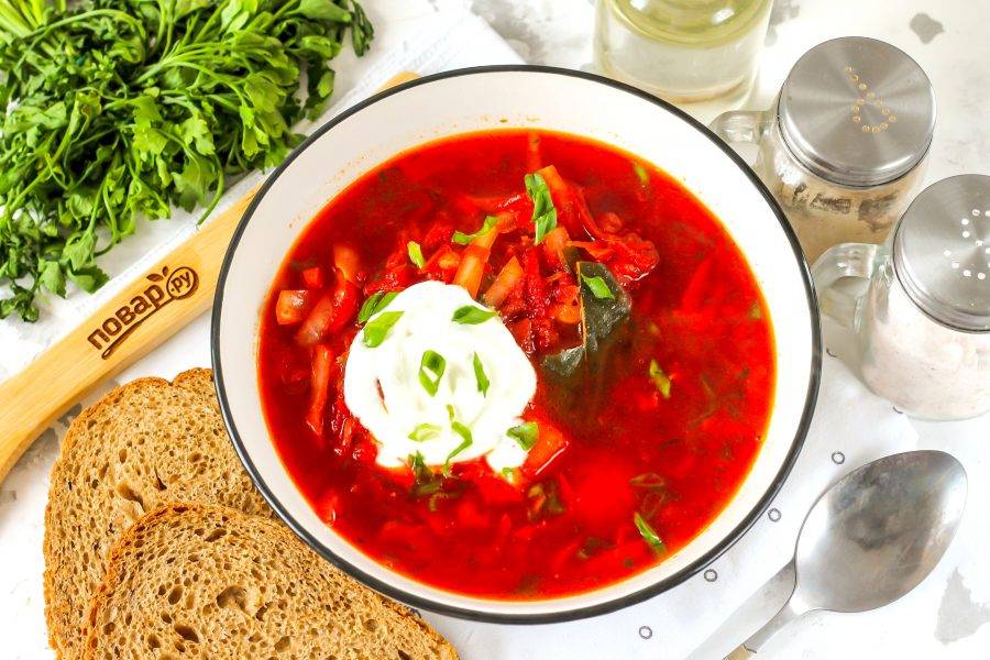 Картофель вымойте, нарежьте небольшими кубиками и выложите в кастрюлю с бульоном. Варите 15 минут на среднем огне. Добавьте в кастрюлю овощи и нашинкованную капусту. Варите борщ до полной готовности. Перед подачей дополните чесноком, сметаной и зеленью. Подавайте с зеленью.