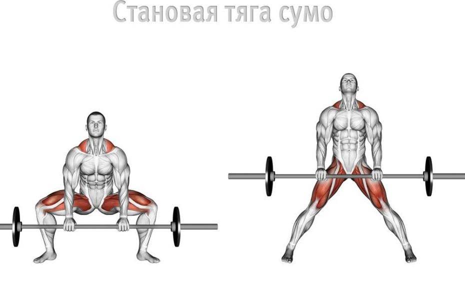 «Сумо» — поднятие снаряда с широко расставленными ногами за счет работы мышц спины, ягодиц, внутренней части бедер и квадрицепсов. Считается одним из лучших упражнений для нижней части тела, особенно для девушек.