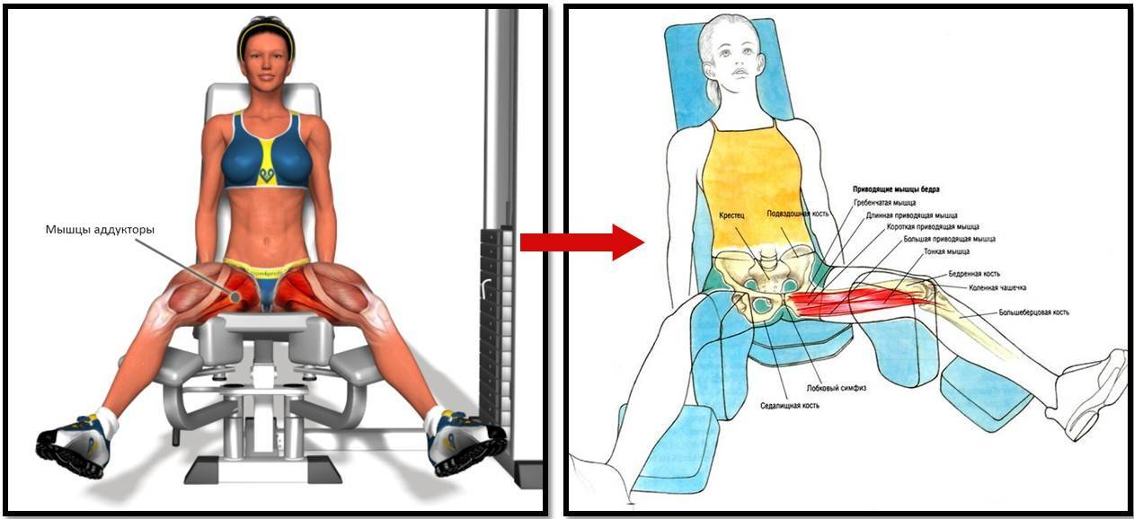 Атлас анатомический мышц, которые участвуют в сведение ног в тренажере, представляет собой такую картину: