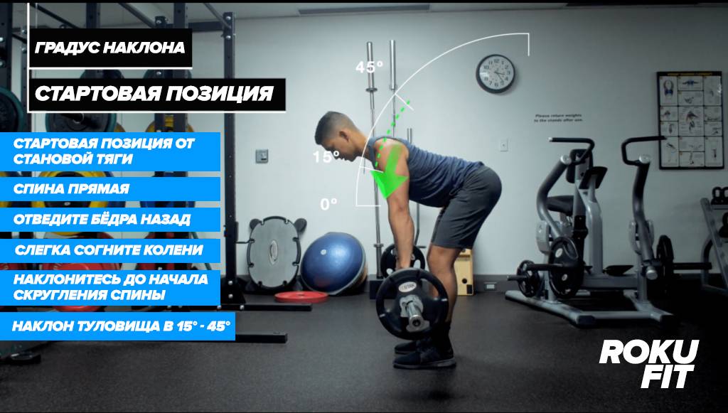 Важно контролировать наклон корпуса, ведь чем выше поднят корпус — тем большая нагрузка приходится на сгибатели руки и верх широчайших, и тем травмоопаснее становится данное упражнение. Эта позиция является исходной в тяге штанги к поясу