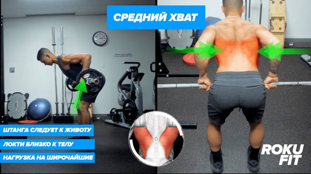 При хвате чуть уже ширины плеч локти будут расположены близко к телу, а тянуть штангу мы будем к животу, при таком хвате мы больше включаем в работу широчайшие мышцы спины. Данный хват мне кажется более эффективным с точки зрения тренировки ширины спины.