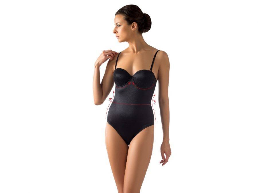 Если необходимо смоделировать прежде всего живот и бока, то стоит выбирать или шорты с высокой посадкой, или комбинезон со специальной утягивающей вставкой. Для акцентирования внимания на ягодицах можно приобрести трусы, а аккуратность груди подчеркнет бюстгальтер