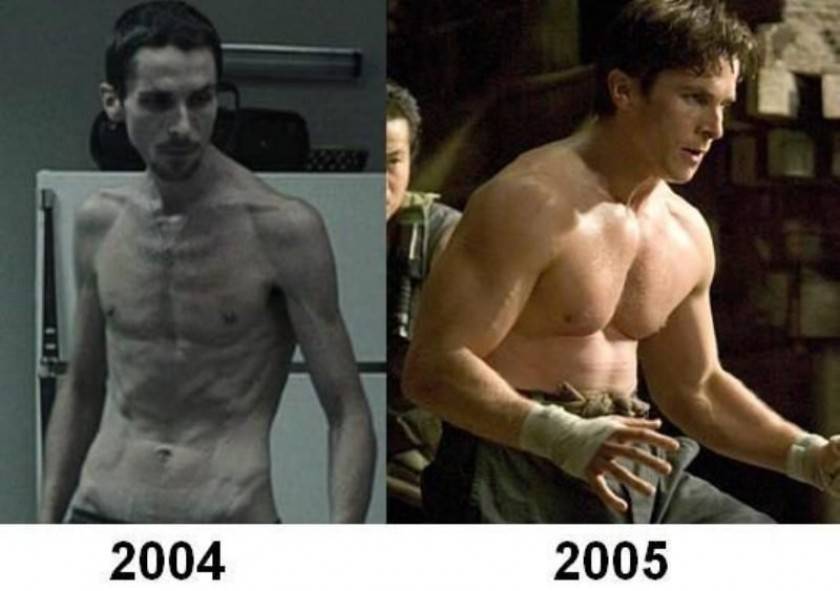 - 2004, для «Бэтмена», первая часть трилогии (главная роль супергероя) — плюс 45 кг за 5 месяцев (с 55 до 100), но это был перебор, и актёру пришлось сбросить 14 кг за 2 месяца (со 100 до 86);