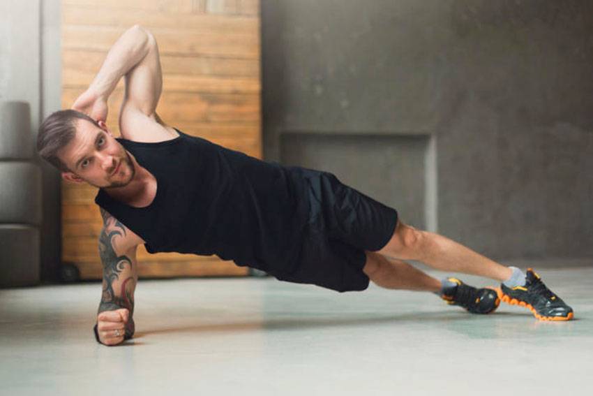 Нужно принять исходное положение для отжимания, подтянуть пресс, втянуть живот, и в этой статической позе провести от 30 секунд до 1 минуты. Боковая планка – это выход на предплечье, с боком, параллельным полу.
