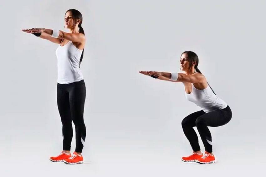 Встать прямо, руки скрестить перед грудью, стараться держать спину вертикально, и не тянуться ягодицами назад. Со вдохом опуститься вниз, разводя колени в стороны, таз – ниже колен. С выдохом – встать прямо. Не наклоняться вперед, не менять положение спины, и не менять положение коленей- не сводить их внутрь.