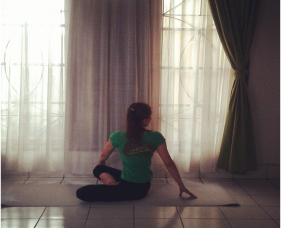 Сядьте на пол, вытянув вперед ноги. Согните ноги в коленях, затем скрестите их. Держите спину прямо, дышите ровно. Поместите правую ладонь на пол справа, рядом с бедрами. На выдохе развернитесь вправо и одновременно положите левую ладонь на правое колено. Можете повернуть шею и посмотреть на плечи. Оставайтесь в такой позиции до тех пор, пока вам комфортно, после чего медленно вернитесь в исходное положение. Повторите движение с левой стороны.