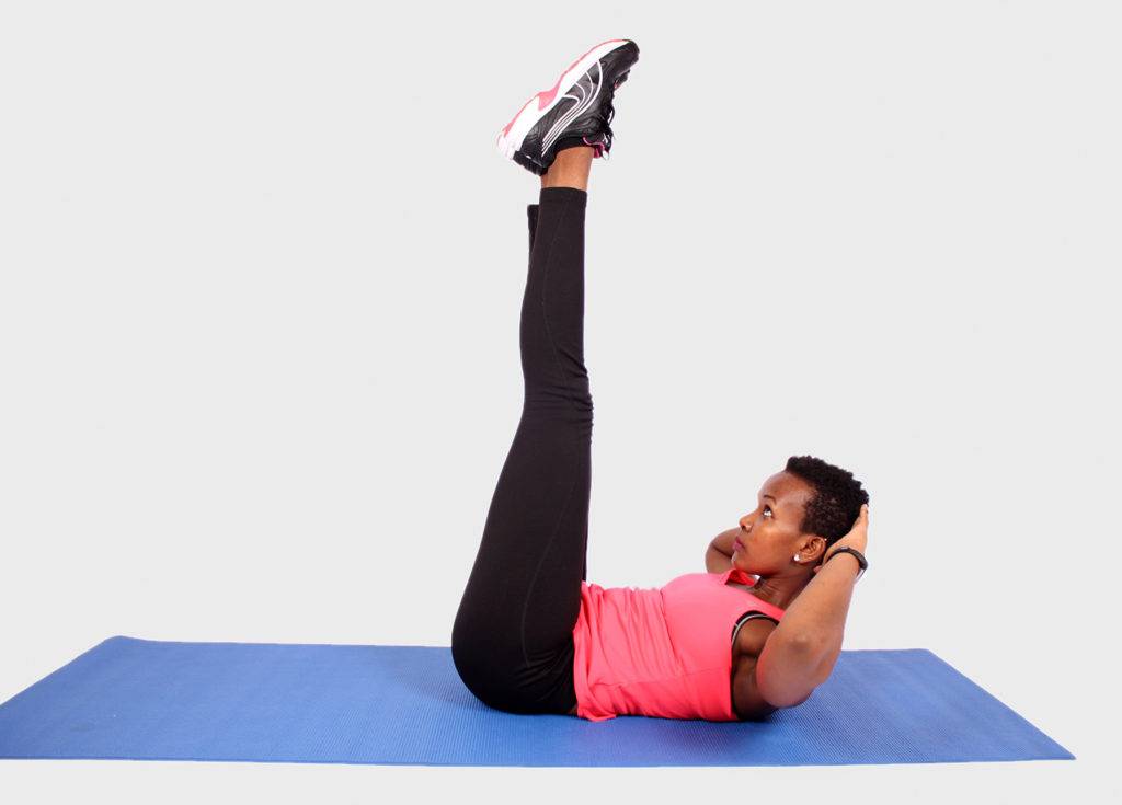 Лежа на спине, руки положите за голову, прямые ноги поднимите вверх вертикально. Оторвите от пола лопатки и высвободите правую руку, стараясь завести ее за левое бедро. Вернитесь в исходное положение и на следующем подходе тянитесь левой рукой к правому бедру. Упражнение тренирует поперечную, прямую и косые мышцы живота, прорисовывая рельеф.