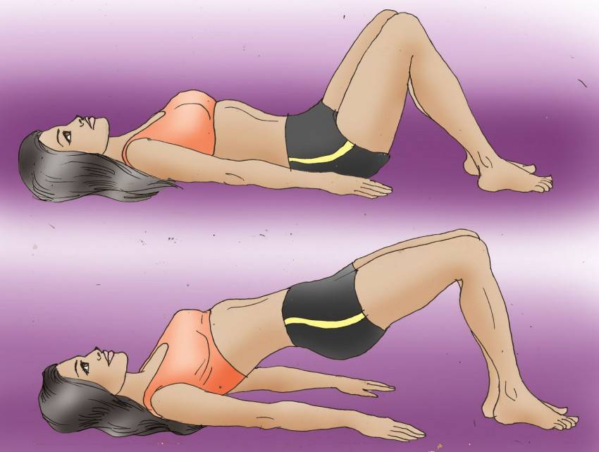 - Удерживая ноги в таком положении, поднимите таз и прожмите ягодицы.