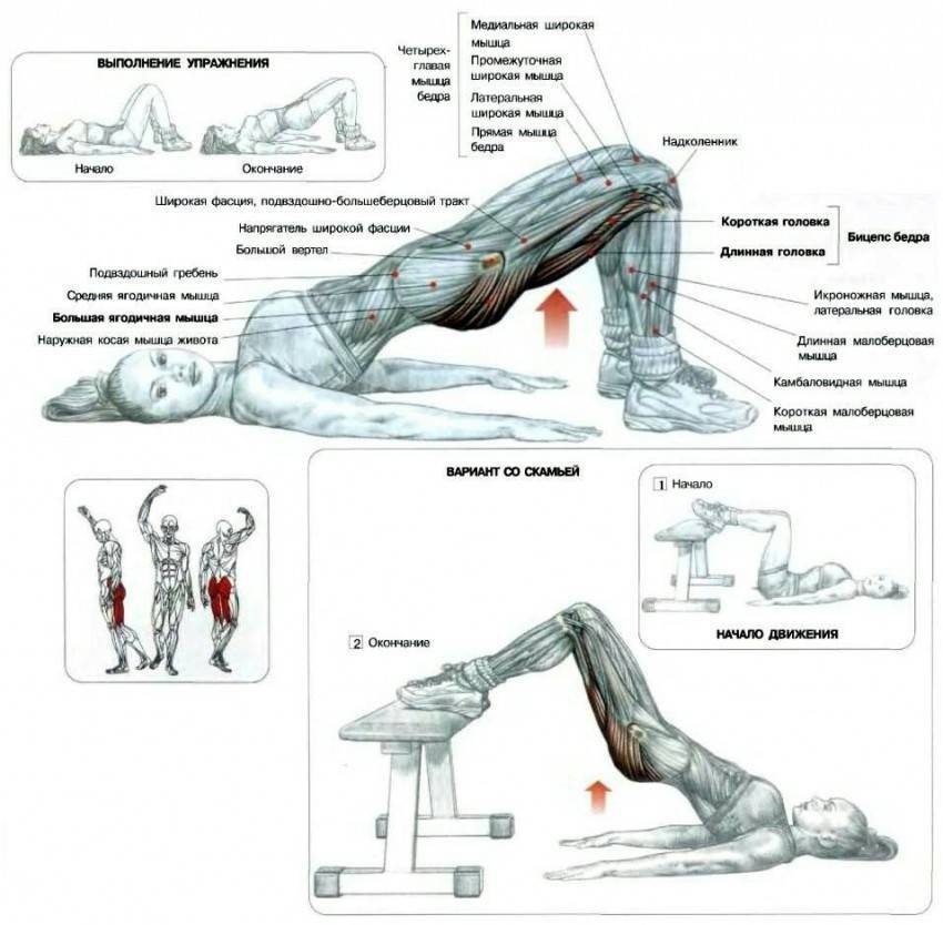 Это упражнение – просто находка для тех, кто не может выполнять присед из-за проблем со спиной, бедрами или болей в коленях. Выполняя этот мостик можно проработать эти мышцы лежа на спине и не нагружая суставы.