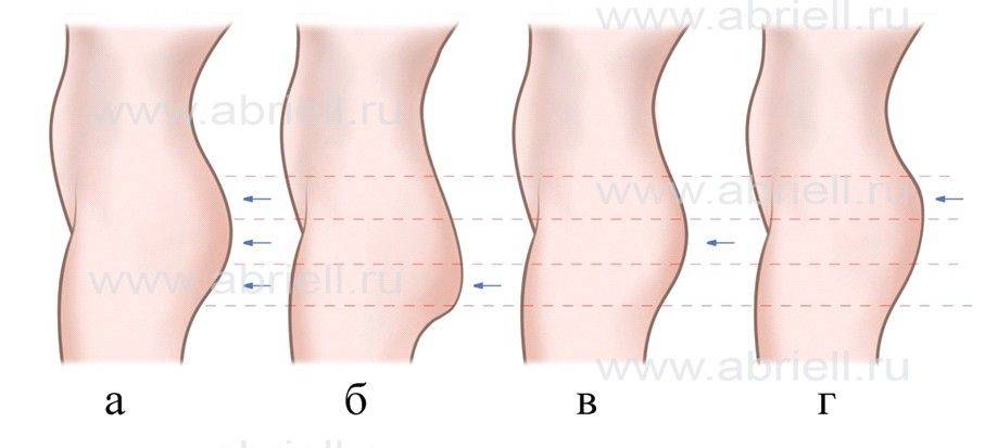 В боковой проекции важно определить, в какой точке ягодичная мышца имеет максимальную проекцию. Могут быть отмечены 3 вида распределения объема: максимальный объем в верхней, средней (центральной) или нижней трети ягодиц (рис