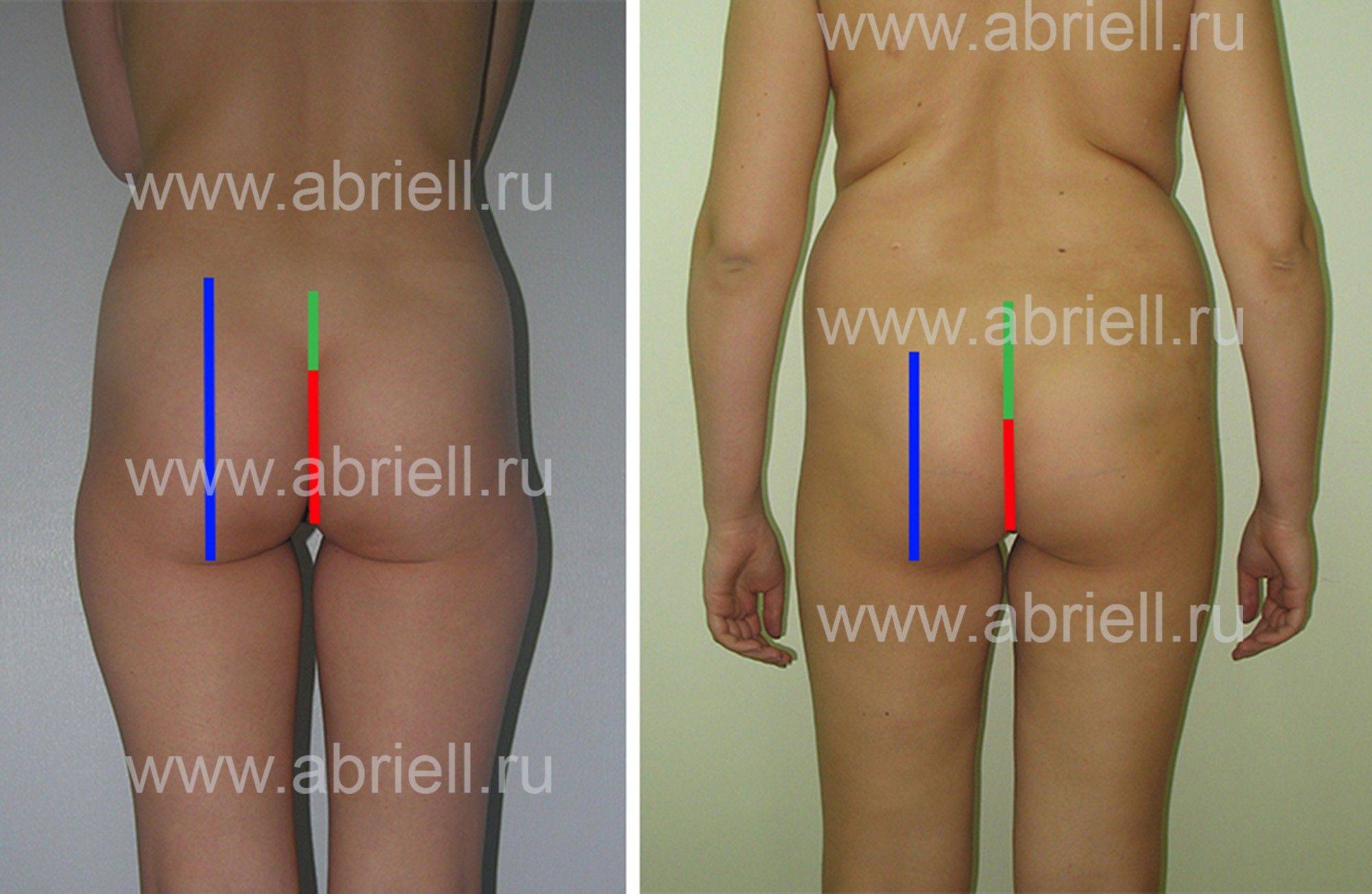 а) Соотношение высоты крестца (зеленая линия) и длины межъягодичной борозды (красная линия) 1:3; соотношение высоты ягодичной мышцы (синяя линия) и межъягодичной борозды (красная линия) 2:1 у пациенток с «идеальными» ягодицами;