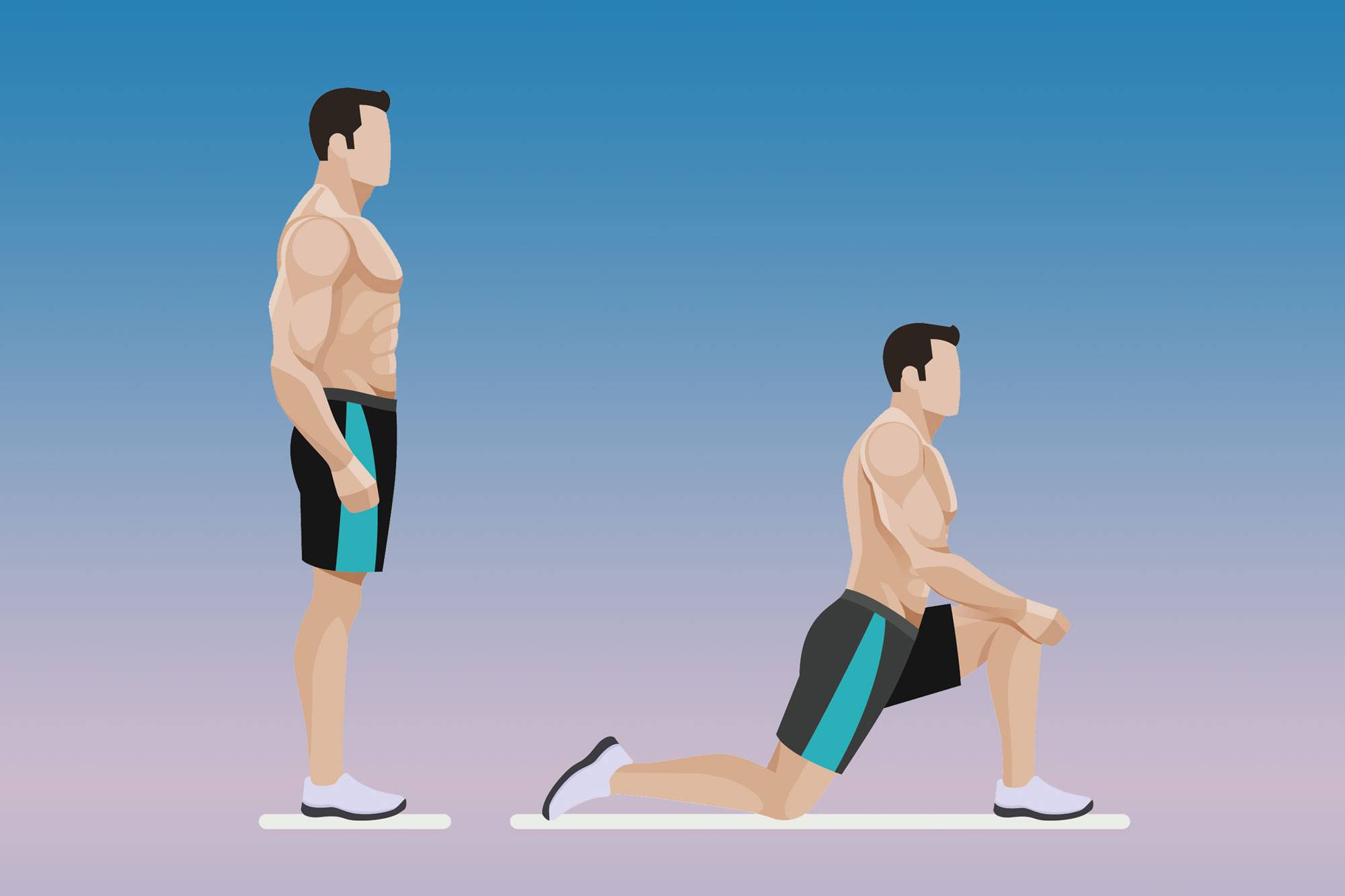 - Рабочей ногой делаем шаг вперед и опускаемся вниз. Колено рабочей ноги не выходит за стопу и являет прямой угол между бедром и голенью. Опорная нога стоит на пальцах, колено «зависает» над полом.