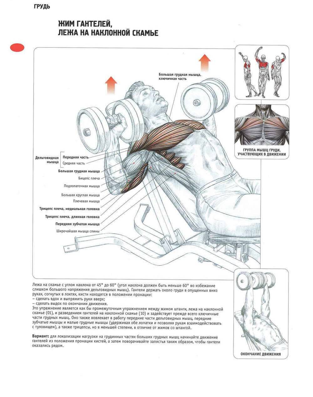 Жим под наклоном вверх, угол доски 30-45 градусов – работает больше верхняя часть грудных мышц.